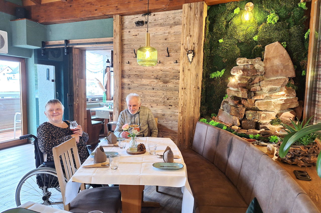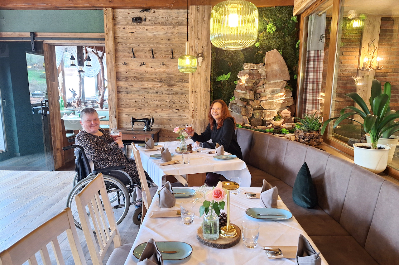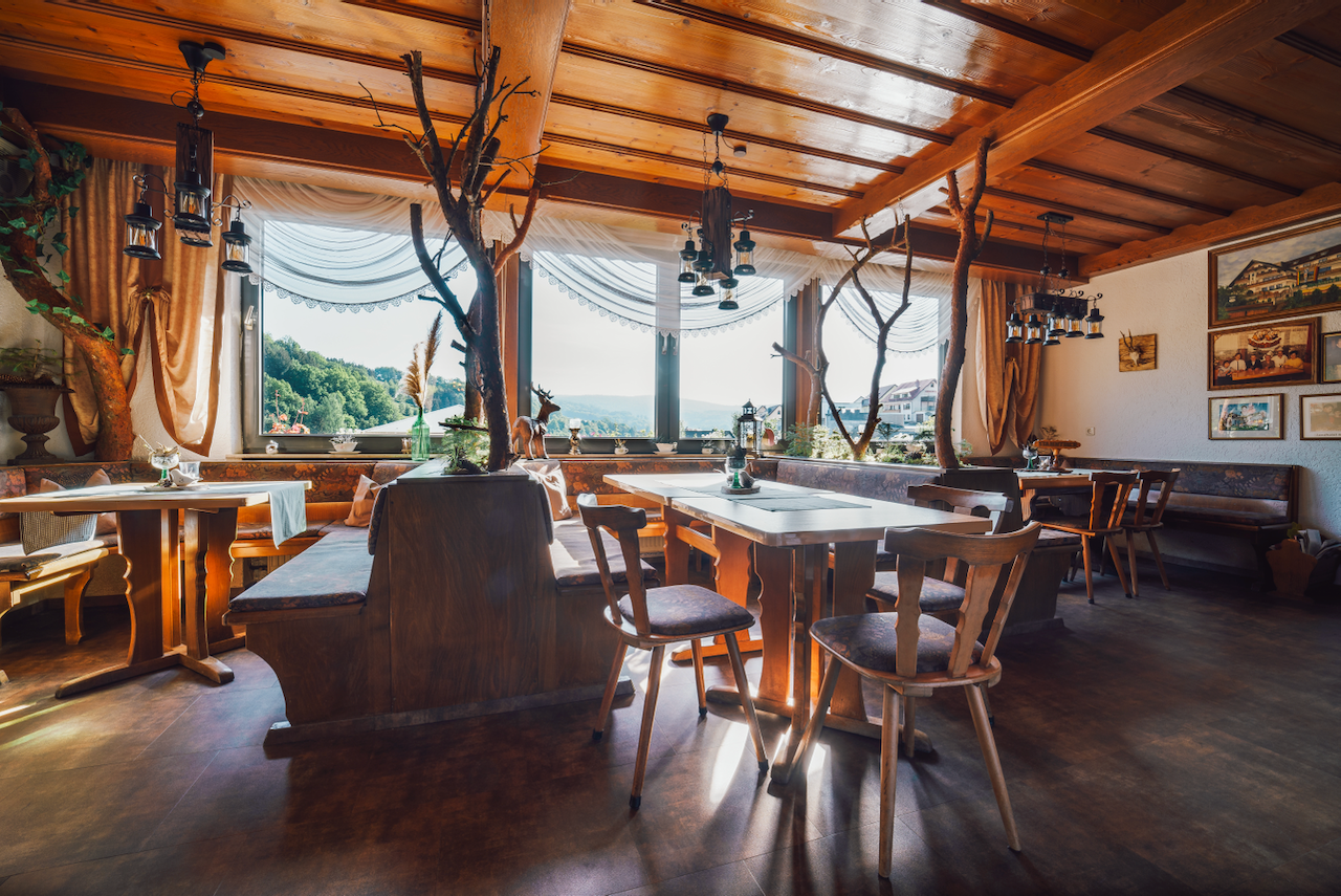 Die Aussicht reicht bis ins Dorf, entlang der schönen Wiesen und Spessartberge. Hier werden TV-Übertragungen und Bingoabende durchgeführt.